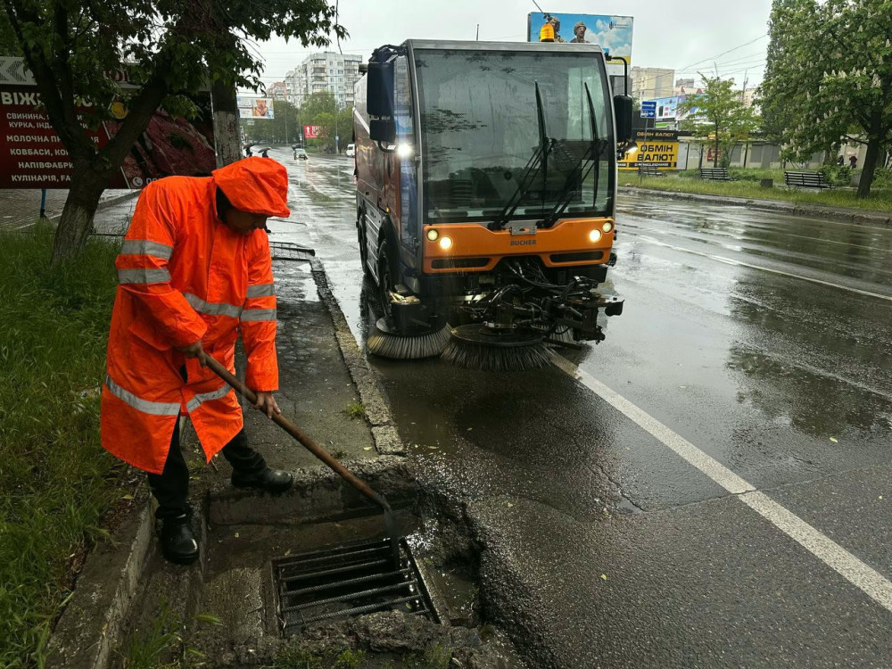 Також на місцях працюють співробітники КП «Міські дороги», які за допомогою екскаваторів зі спеціальними насадками або вручну оперативно очищають дощоприймачі та зливові колодязі від сміття, гілок і листя, яке зносить туди з вулиць міста дощова вода.