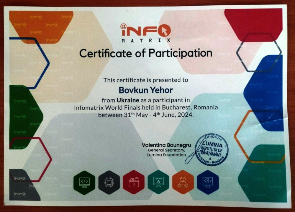 З 31 травня по 3 червня 2024 року в Бухаресті (Румунія) пройшов міжнародний фінал конкурсу комп'ютерних проектів INFOMATRIX-2024.