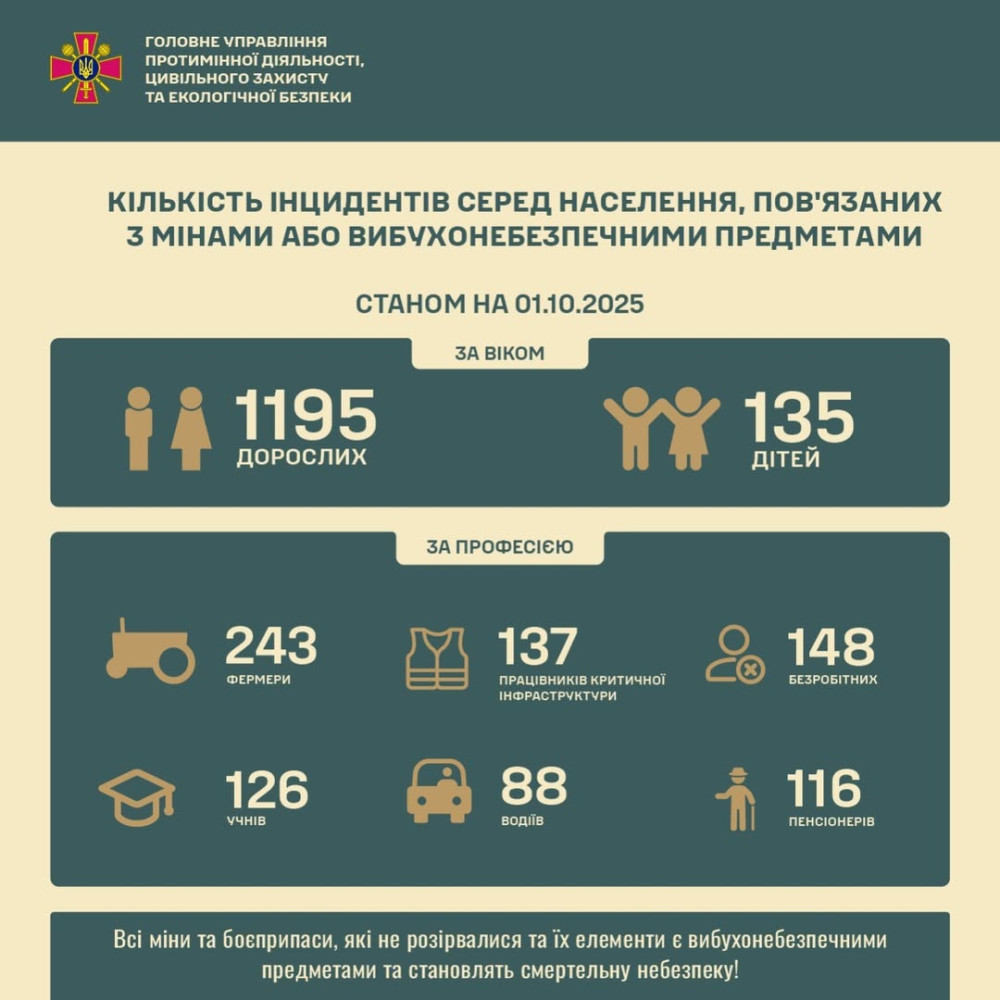 З початку війни в Україні через небезпечні міни та вибухонебезпечні предмети постраждало 1 330 осіб, з них 135 - діти. Це дані, які надає Головне управління протимінної діяльності, цивільного захисту та екологічної безпеки у соцмережах.